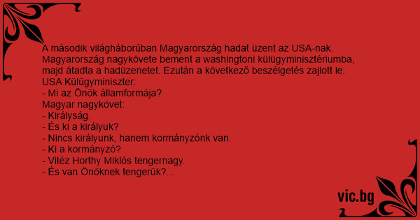 A második világháborúban Magyarország hadat üzent az USA-nak. Magyarország nagykövete bement a washingtoni külügyminisztériumba, majd átadta a hadüzenetet. Ezután a következő beszélgetés zajlott le: