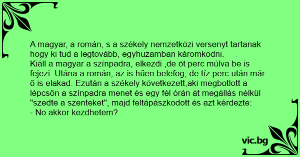 A magyar, a román, s a székely nemzetközi versenyt tartanak hogy ki tud a legtovább, egyhuzamban káromkodni.