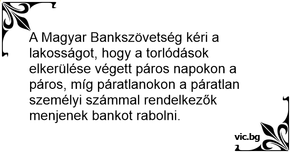 A Magyar Bankszövetség kéri a lakosságot, hogy a torlódások elkerülése végett páros napokon a páros, míg páratlanokon a páratlan személyi számmal rendelkezők menjenek bankot rabolni.