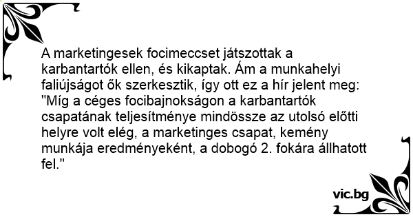 A marketingesek focimeccset játszottak a karbantartók ellen, és kikaptak. Ám a munkahelyi faliújságot ők szerkesztik, így ott ez a hír jelent meg: