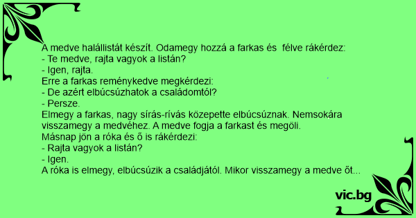 A medve halállistát készít. Odamegy hozzá a farkas és félve rákérdez: