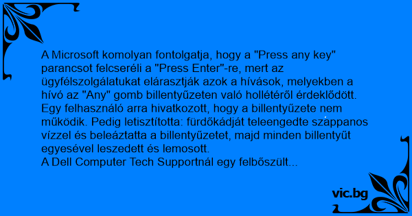 A Microsoft komolyan fontolgatja, hogy a "Press any key" parancsot felcseréli a "Press Enter"-re, mert az ügyfélszolgálatukat elárasztják azok a hívások, melyekben a hívó az "Any" gomb billentyűzeten való hollétéről érdeklődött.