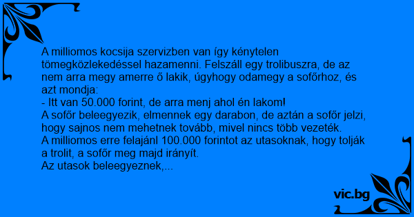 A milliomos kocsija szervizben van így kénytelen tömegközlekedéssel hazamenni. Felszáll egy trolibuszra, de az nem arra megy amerre ő lakik, úgyhogy odamegy a sofőrhoz, és azt mondja: