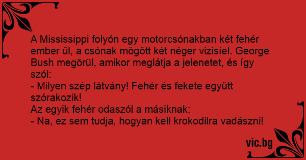 A Mississippi folyón egy motorcsónakban két fehér ember ül, a csónak mögött két néger vizisíel. George Bush megörül, amikor meglátja a jelenetet, és így szól: