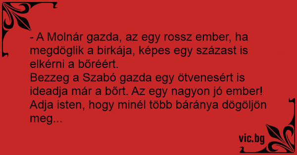 Bezzeg a Szabó gazda egy ötvenesért is ideadja már a bőrt. Az egy nagyon jó ember! Adja isten, hogy minél több báránya dögöljön meg...