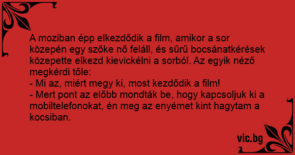 A moziban épp elkezdődik a film, amikor a sor közepén egy szőke nő feláll, és sűrű bocsánatkérések közepette elkezd kievickélni a sorból. Az egyik néző megkérdi tőle: