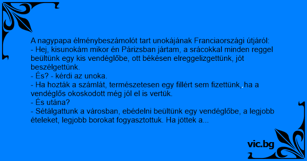 Az unokának nagyon tetszik az élménybeszámoló, gondolja ezt ő is kipróbálja. Befizet a haverjaival egy párizsi útra. Egy hét múlva jön vissza, össze-vissza van verve, ki vannak törve a fogai, ruhája szétszakadva.