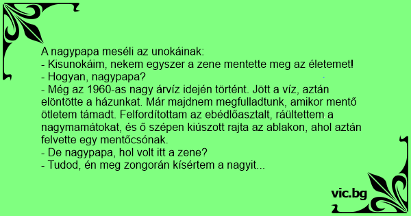 - Még az 1960-as nagy árvíz idején történt. Jött a víz, aztán elöntötte a házunkat. Már majdnem megfulladtunk, amikor mentő ötletem támadt. Felfordítottam az ebédlőasztalt, ráültettem a nagymamátokat, és ő szépen kiúszott rajta az ablakon, ahol aztán felvette egy mentőcsónak.