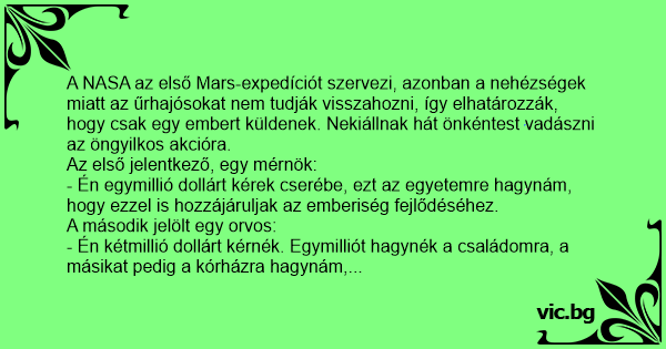 - Nézzék, egymilliót adok maguknak, egymilliót megtartok magamnak, a harmadik millió a mérnöké, hogy menjen ő helyettem.
