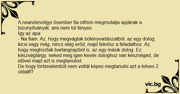 A neandervölgyi ősember fia otthon megmutatja apjának a bizonyítványát, ami nem túl fényes.