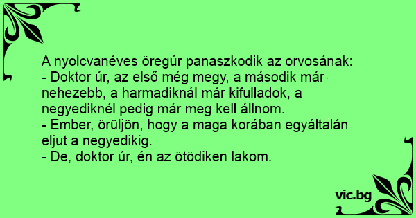 - Doktor úr, az első még megy, a második már nehezebb, a harmadiknál már kifulladok, a negyediknél pedig már meg kell állnom.