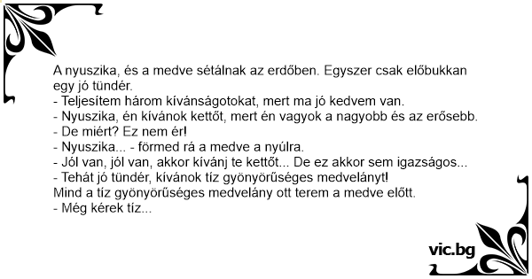- Tehát jó tündér, kívánok tíz gyönyörűséges medvelányt!