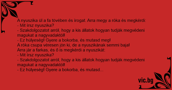 A nyuszika ül a fa tövében és írogat. Arra megy a róka és megkérdi: - Mit írsz nyuszika? - Szakdolgozatot arról, hogy a kis állatok hogyan tudják megvédeni magukat a nagyvadaktól! - Ez hülyeség! Gyere a bokorba, és mutasd meg! A róka csupa véresen jön ki, de a nyuszikának semmi baja! Arra jár a farkas, és ő is megkérdi a nyuszikát: - Mit írsz nyuszika? - Szakdolgozatot arról, hogy a kis állatok hogyan tudják megvédeni magukat a nagyvadaktól! - Ez hülyeség! Gyere a bokorba, és mutasd meg! A farkas csupa véresen jön ki, de a nyuszikának semmi baja! Arra jár a medve! Megkérdi: - Mit írsz nyuszika? - Szakdolgozatot arról, hogy a kis állatok hogyan tudják megvédeni magukat a nagyvadaktól! - Ez hülyeség! Gyere a bokorba, és mutasd meg! A medve csupa véresen jön ki, de a nyuszikának semmi baja! Kijön utána az oroszlán, és így szól: - Látod nyuszika, nem az számít, hogy miről írsz szakdolgozatot, hanem az, hogy ki a konzulensed!