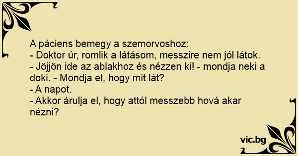 Üdvözlöm doktor úr! Gond van a szemeimmel, nem jól látok távolra. - Kérem jöjjön ide az ablakhoz és mondja meg mit lát. - A napot. - Akkor mondja már meg nekem, hová a fenébe akar maga ettől...