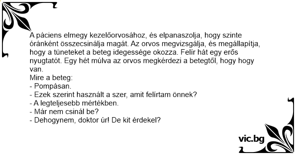 A páciens elmegy kezelőorvosához, és elpanaszolja, hogy szinte óránként összecsinálja magát. Az orvos megvizsgálja, és megállapítja, hogy a tüneteket a beteg idegessége okozza. Felír hát egy erős nyugtatót. Egy hét múlva az orvos megkérdezi a betegtől, hogy hogy van.