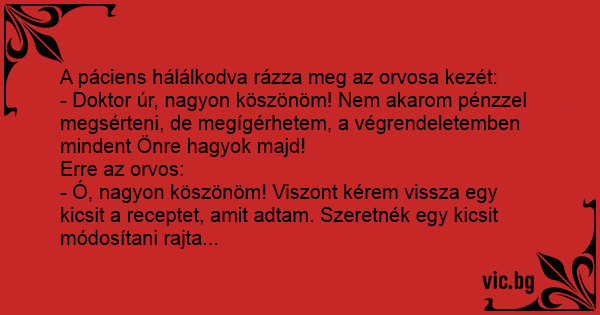 - Doktor úr, nagyon köszönöm! Nem akarom pénzzel megsérteni, de megígérhetem, a végrendeletemben mindent Önre hagyok majd!