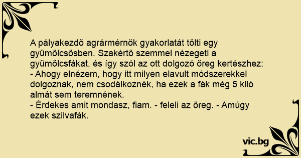 A pályakezdő agrármérnök gyakorlatát tölti egy gyümölcsösben. Szakértő szemmel nézegeti a gyümölcsfákat, és így szól az ott dolgozó öreg kertészhez:
