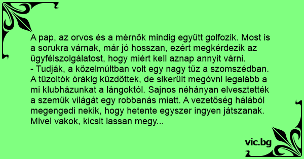 A pap, az orvos és a mérnök mindig együtt golfozik. Most is a sorukra várnak, már jó hosszan, ezért megkérdezik az ügyfélszolgálatost, hogy miért kell aznap annyit várni.