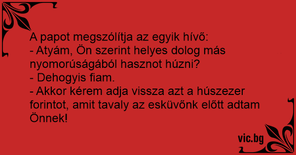 - Akkor kérem adja vissza azt a húszezer forintot, amit tavaly az esküvőnk előtt adtam Önnek!