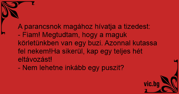 - Fiam! Megtudtam, hogy a maguk körletünkben van egy buzi. Azonnal kutassa fel nekem!Ha sikerül, kap egy teljes hét eltávozást!