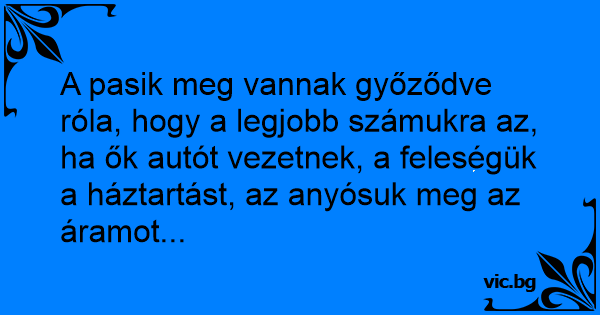 A pasik meg vannak győződve róla, hogy a legjobb számukra az, ha ők autót vezetnek, a feleségük a háztartást, az anyósuk meg az áramot...