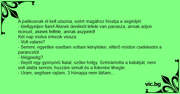 - Idefigyeljen fiam! Akinek deréktól lefele van panasza, annak adjon ricinust, akinek felfele, annak aszpirint!