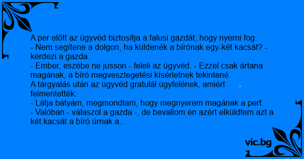 - Valóban - válaszol a gazda -, de bevallom én azért elküldtem azt a két kacsát a bíró úrnak a másik fickó nevében.