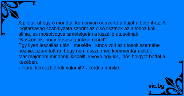 A pilóta, ahogy ő mondta, keményen odaverte a hajót a betonhoz. A légitársaság szabályzata szerint az első tisztnek az ajtóhoz kell állnia, és mosolyogva ismételgetni a kiszálló utasoknak: