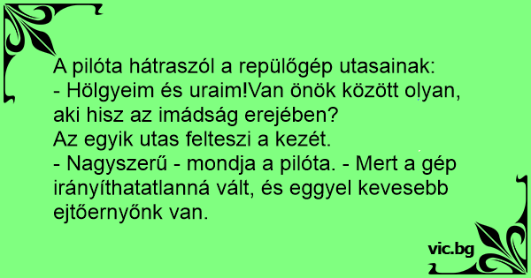 - Nagyszerű - mondja a pilóta. - Mert a gép irányíthatatlanná vált, és eggyel kevesebb ejtőernyőnk van.
