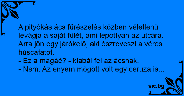 A pityókás ács fűrészelés közben véletlenül levágja a saját fülét, ami lepottyan az utcára. Arra jön egy járókelő, aki észreveszi a véres húscafatot.