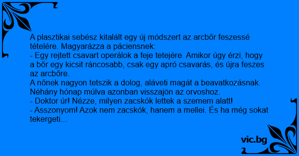 A plasztikai sebész kitalált egy új módszert az arcbőr feszessé tételére. Magyarázza a páciensnek: