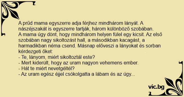 A mama úgy dönt, hogy mindhárom helyen fülel egy kicsit. Az első szobában nagy sikoltozást hall, a másodikban kacagást, a harmadikban néma csend. Másnap előveszi a lányokat és sorban kérdezgeti őket: