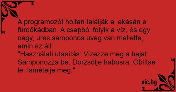 A programozót holtan találják a lakásán a fürdőkádban. A csapból folyik a víz, és egy nagy, üres samponos üveg van mellette, amin ez áll: