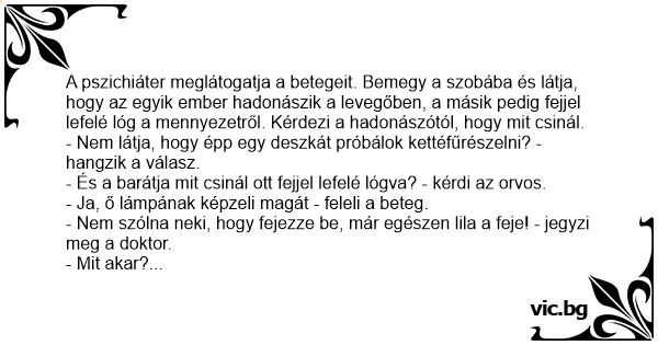A pszichiáter meglátogatja a betegeit. Bemegy a szobába és látja, hogy az egyik ember hadonászik a levegőben, a másik pedig fejjel lefelé lóg a mennyezetről. Kérdezi a hadonászótól, hogy mit csinál.