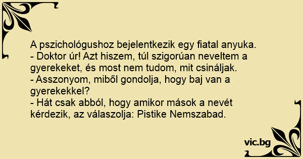 - Doktor úr! Azt hiszem, túl szigorúan neveltem a gyerekeket, és most nem tudom, mit csináljak.