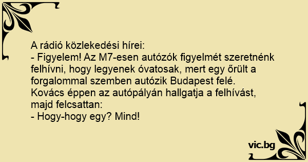- Figyelem! Az M7-esen autózók figyelmét szeretnénk felhívni, hogy legyenek óvatosak, mert egy őrült a forgalommal szemben autózik Budapest felé.