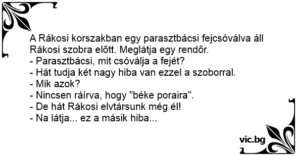 A Rákosi korszakban egy parasztbácsi fejcsóválva áll Rákosi szobra előtt. Meglátja egy rendőr.