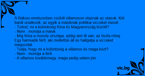 A Rákosi-rendszerben zsúfolt villamoson utaznak az utasok. Két barát unatkozik, az egyik a másiknak politikai vicceket mesél.
