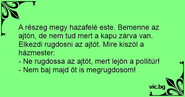 A részeg megy hazafelé este. Bemenne az ajtón, de nem tud mert a kapu zárva van. Elkezdi rugdosni az ajtót. Mire kiszól a házmester: