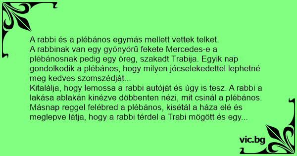 A rabbinak van egy gyönyörű fekete Mercedes-e a plébánosnak pedig egy öreg, szakadt Trabija. Egyik nap gondolkodik a plébános, hogy milyen jócselekedettel lephetné meg kedves szomszédját...