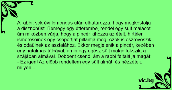A rabbi, sok évi lemondás után elhatározza, hogy megkóstolja a disznóhúst. Bemegy egy étterembe, rendel egy sült malacot, ám miközben várja, hogy a pincér kihozza az ételt, hirtelen ismerőseinek egy csoportját pillantja meg. Azok is észreveszik és odaülnek az asztalához. Ekkor megjelenik a pincér, kezében egy hatalmas tálcával, amin egy egész sült malac fekszik, a szájában almával. Döbbent csend, ám a rabbi feltalálja magát:
