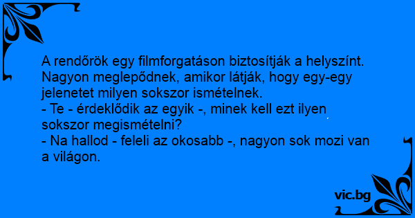 A rendőrök egy filmforgatáson biztosítják a helyszínt. Nagyon meglepődnek, amikor látják, hogy egy-egy jelenetet milyen sokszor ismételnek.