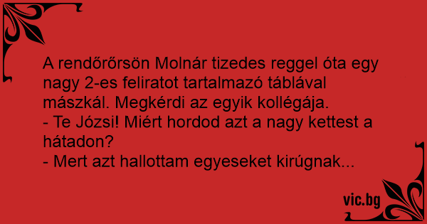 A rendőrőrsön Molnár tizedes reggel óta egy nagy 2-es feliratot tartalmazó táblával mászkál. Megkérdi az egyik kollégája.