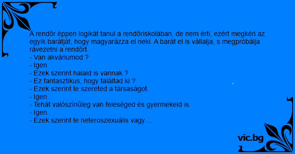 - Tudod te, mi a logika? - kérdi a rendőr a társától. - Micsoda? - Na majd megmagyarázom. Van neked akváriumod? - Van... - Ebből logikusan következik, hogy te szereted az állatokat. Így van? - Így....