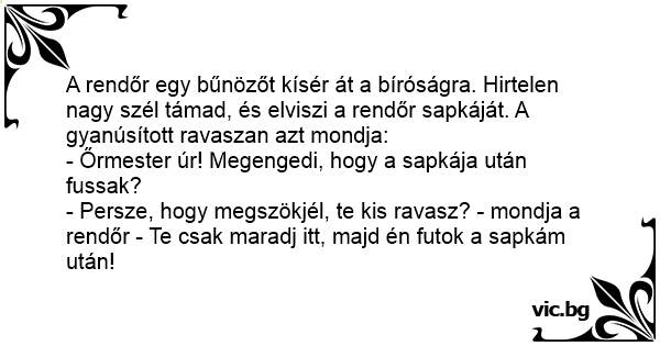 - Persze, hogy megszökjél, te kis ravasz? - mondja a rendőr - Te csak maradj itt, majd én futok a sapkám után!