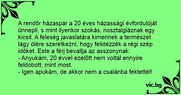 A rendőr házaspár a 20 éves házassági évfordulóját ünnepli, s mint ilyenkor szokás, nosztalgiáznak egy kicsit. A feleség javaslatára kimennek a természet lágy ölére szeretkezni, hogy felidézzék a régi szép időket. Este a férj bevallja az asszonynak: