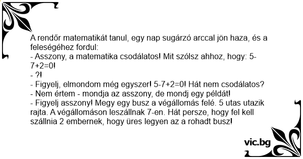 - Figyelj asszony! Megy egy busz a végállomás felé. 5 utas utazik rajta. A végállomáson leszállnak 7-en. Hát persze, hogy fel kell szállnia 2 embernek, hogy üres legyen az a rohadt busz!