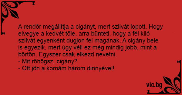 A rendőr megállítja a cigányt, mert szilvát lopott. Hogy elvegye a kedvét tőle, arra bünteti, hogy a fél kiló szilvát egyenként dugjon fel magának. A cigány bele is egyezik, mert úgy véli ez még mindig jobb, mint a börtön. Egyszer csak elkezd nevetni.