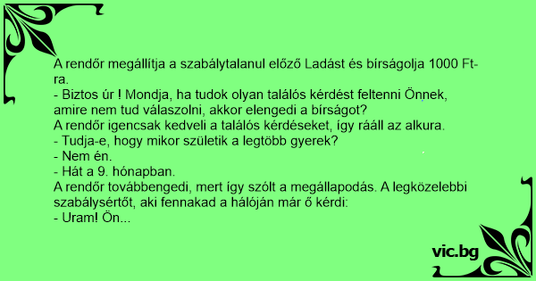 - Uram! Ön szabálytalanul közlekedett, ezért megbírságolom, de ha egy találós kérdésre tudja a választ, akkor továbbengedem. Melyik hónapban születik a legtöbb gyerek?