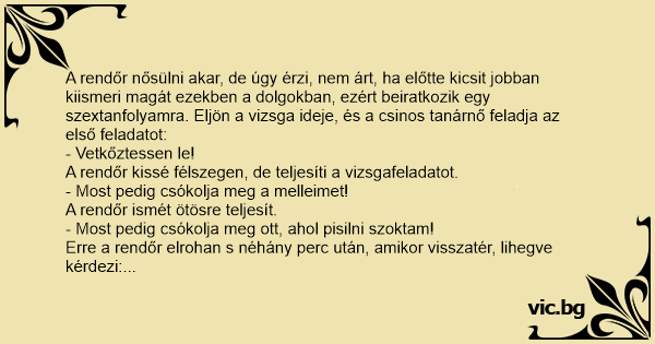A rendőr nősülni akar, de úgy érzi, nem árt, ha előtte kicsit jobban kiismeri magát ezekben a dolgokban, ezért beiratkozik egy szextanfolyamra. Eljön a vizsga ideje, és a csinos tanárnő feladja az első feladatot: